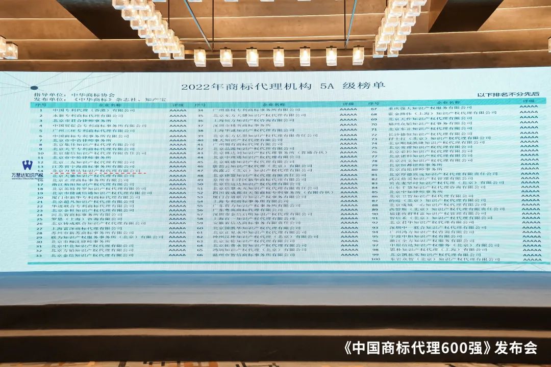 万慧达知识产权入列《中国商标代理600强》5A级TOP100榜单
