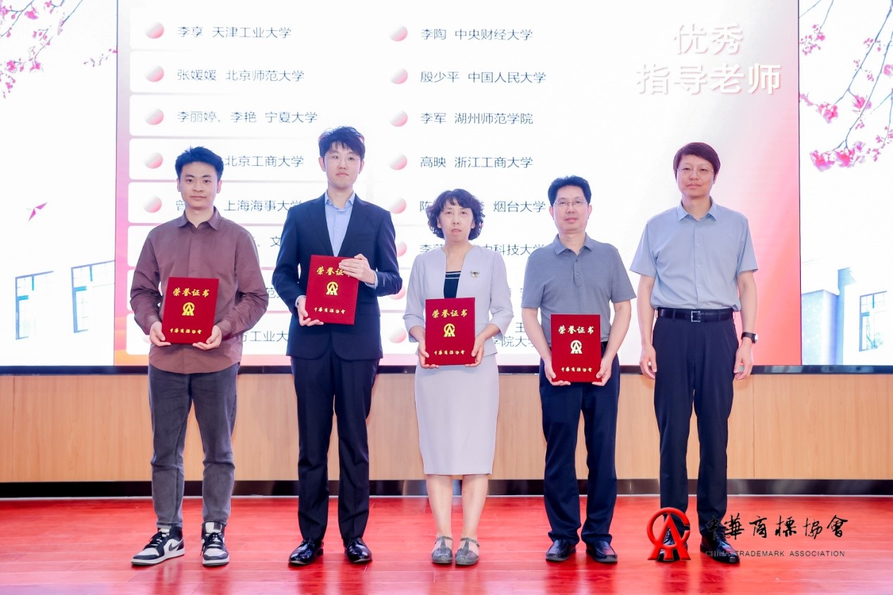 中华商标协会副秘书长、《中华商标》杂志社社长张豫宁(右一)为优秀指导老师和优秀领队代表颁奖