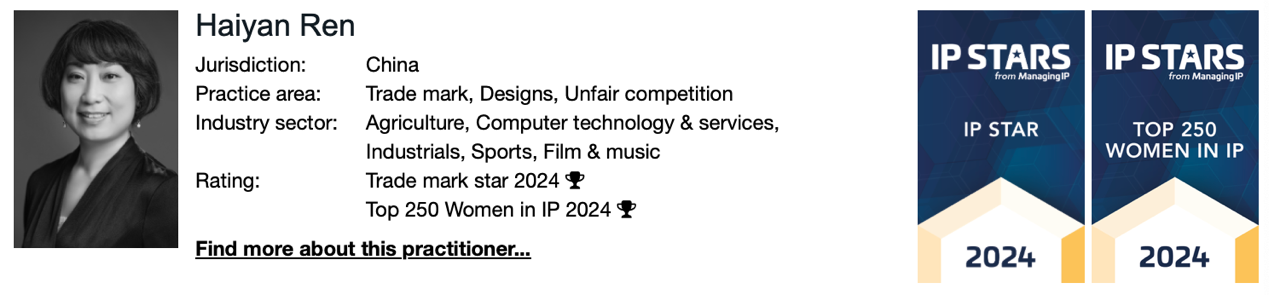 Managing IP also reveals The Top 250 Women in IP to recognise women leaders and senior IP practitioners who consistently go above and beyond for their clients and firms. Ren Haiyan made her debut in the list in 2020 and has remained on that list ever since.