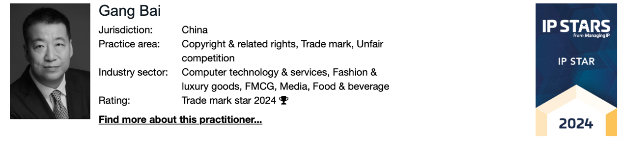 On May 31st, 2024, prestigious legal media Managing IP announces the publication of the IP Stars list for 2024. The IP Stars are senior practitioners who have been recommended or identified as leaders in their firm and/or jurisdiction. The 2024 IP Stars list is primarily based on research information obtained in 2023.