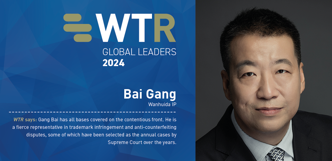 Gang Bai, Founding Partner and Management Committee Chair of Wanhuida Intellectual Property, together with his fellow partners Dr. Hui Huang and Ms. Haiyan Ren are recognised in WTR Global Leaders 2024.