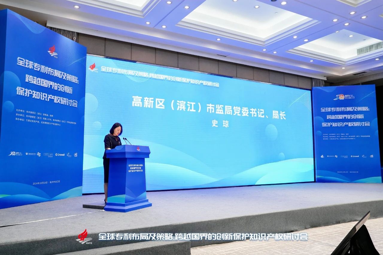 2024年10月18日下午,由杭州高新区(滨江)管委会、政府主办,杭州高新区(滨江)党委人才办、杭州高新区(滨江)市场监督管理局承办,万慧达知识产权、北京君策知识产权发展中心联合协办的“全球专利布局及策略跨越国界的创新保护知识产权研讨会”在市滨江区智慧e谷大楼成功举办。区市场监管局党委书记、局长史琼参加会议并致辞。