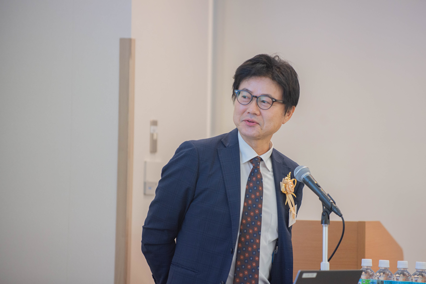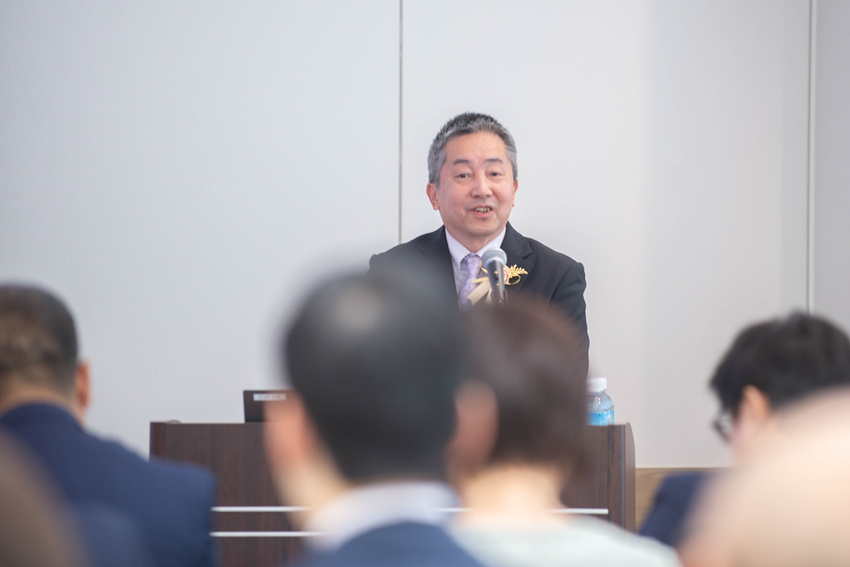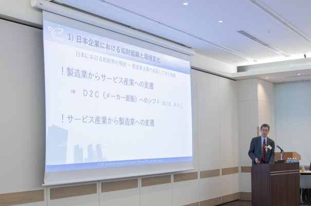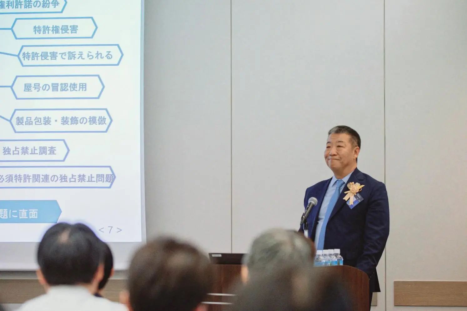 齐藤浩二以“企业中的知识产权活动——商标品牌价值的提升”为题发表演讲。他首先分析了日本产业结构变迁与知识产权发展的现状,其次阐述了商标作为知识产权的重要性及提升其影响力的举措,最后介绍了企业在打击仿冒产品和应对恶意商标申请方面的实践经验。"
