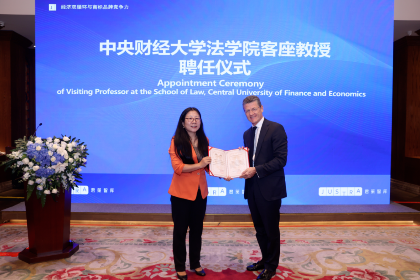 会议举办了中央财经大学法学院客座教授聘任仪式,由杜颖教授代表中央财经大学法学院向国际商标协会首席执行官Etienne Sanz de Acedo先生颁发客座教授聘书。