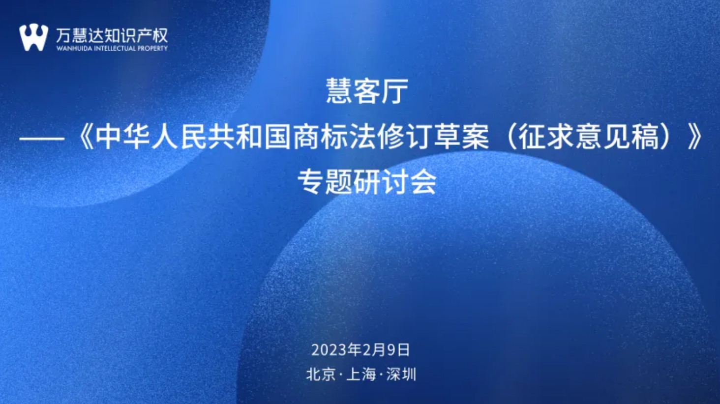 针对草案中涉及的诸多结构性和细节性的修改,万慧达知识产权于2023年2月9日特别举办“慧客厅——《中华人民共和国商标法修订草案(征求意见稿)》研讨会”,与参会的专家、企业代表和其他专业人士对草案进行了解读,剖析了草案相较于现行商标法的主要变化,讨论了草案可能会在实操层面带来的影响,并对下一步的修改给出了建议。