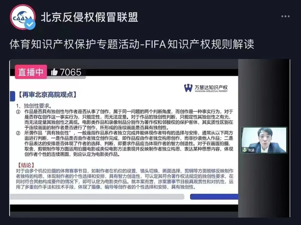 2022年11月22日,万慧达知识产权合伙人张涵律师受北京反侵权假冒联盟(CAASA)邀请做客联盟抖音直播间,以“FIFA知识产权规则解读”为题面向企业进行精彩的线上课程分享,千余名学员在线参加。