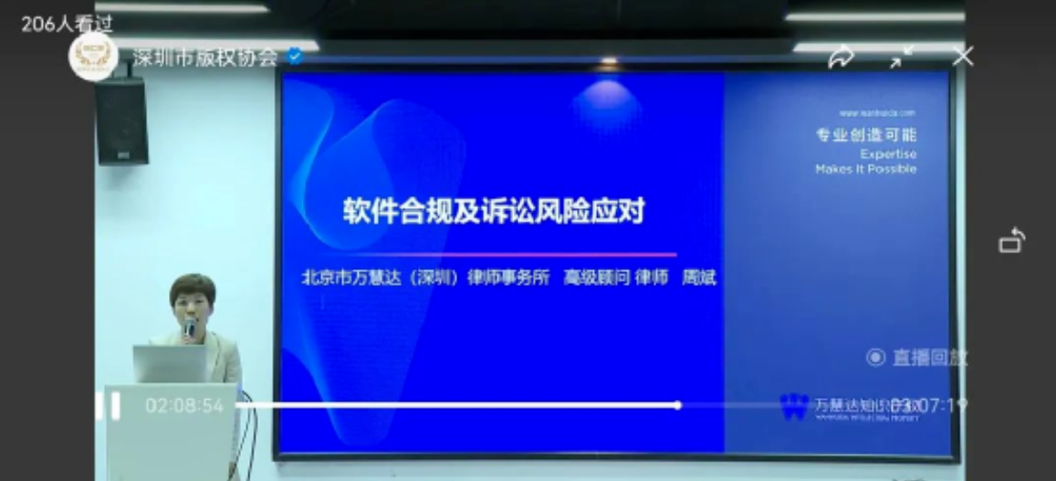 2022年10月21日,由深圳市知识产权局指导,深圳市版权协会主办的“深圳市企业软件正版化培训会”通过线上直播方式顺利开展。会议邀请原深圳市中级人民法院知识产权审判庭审判长于春辉法官,广东省交通集团信息中心高级工程师龙昱瑄老师,深圳市知识产权专家库专家、万慧达知识产权周斌律师从不同的角度进行授课。