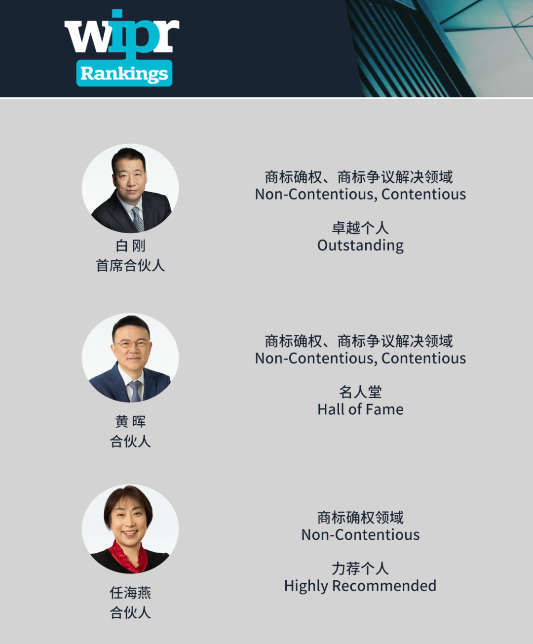 万慧达知识产权管委会主席、首席合伙人白刚先生,管委会成员、合伙人黄晖博士和任海燕女士因其卓越实力、精准策略和优质服务在商标确权、商标争议解决领域获得推荐。