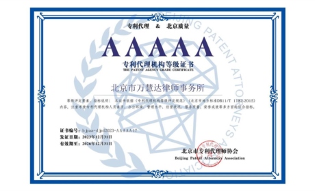 北京市万慧达律师事务所再度获评“AAAAA级专利代理机构”2024.04.01北京市万慧达律师事务所再度获评“AAAAA级专利代理机构”近日,北京市专利代理师协会发布关于2023年专利代理机构等级评定结果的公示。北京市万慧达律师事务所凭借出色的专业能力和优秀的服务质量,再次获评“AAAAA级专利代理机构”。2024.04.01 -