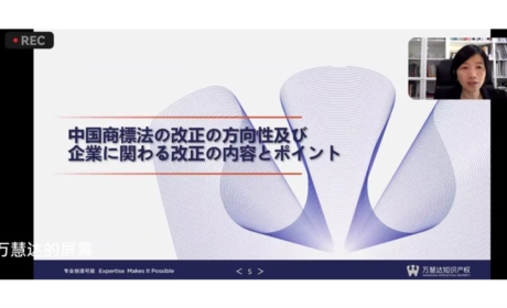 万慧达知识产权管委会成员、合伙人李斌线上参与“中国商标法修改...2023.09.21万慧达知识产权管委会成员、合伙人李斌线上参与“中国商标法修改动向以及企业应对策略”讲座并做演讲2023年9月21日,由大阪发明协会主办的《中国商标法修改动向以及企业应对策略》讲座以视频会议的方式召开。共有包括明治控股、KANEKA、AICOM、SNK等公司的近50名企业知识产权人员参会。万慧达知识产权管委会成员、合...2023.09.21 -
